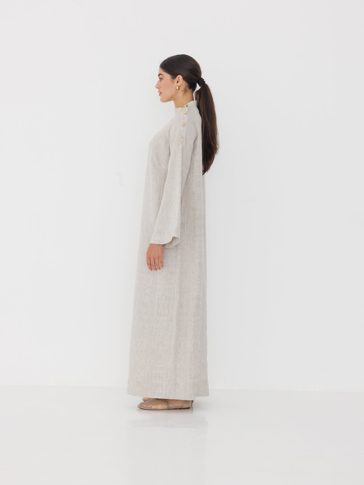 A delicate sunflower motif adds warmth to the design, while a small key detail reflects meaning, memory, and the idea of return. Light, effortless, and considered, Awaan is a piece made to be worn slowly — during Ramadan and far beyond.